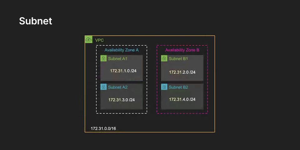 - Subnet은 VPC CIDR 범위 안에서 IP 주소 집합을 관리