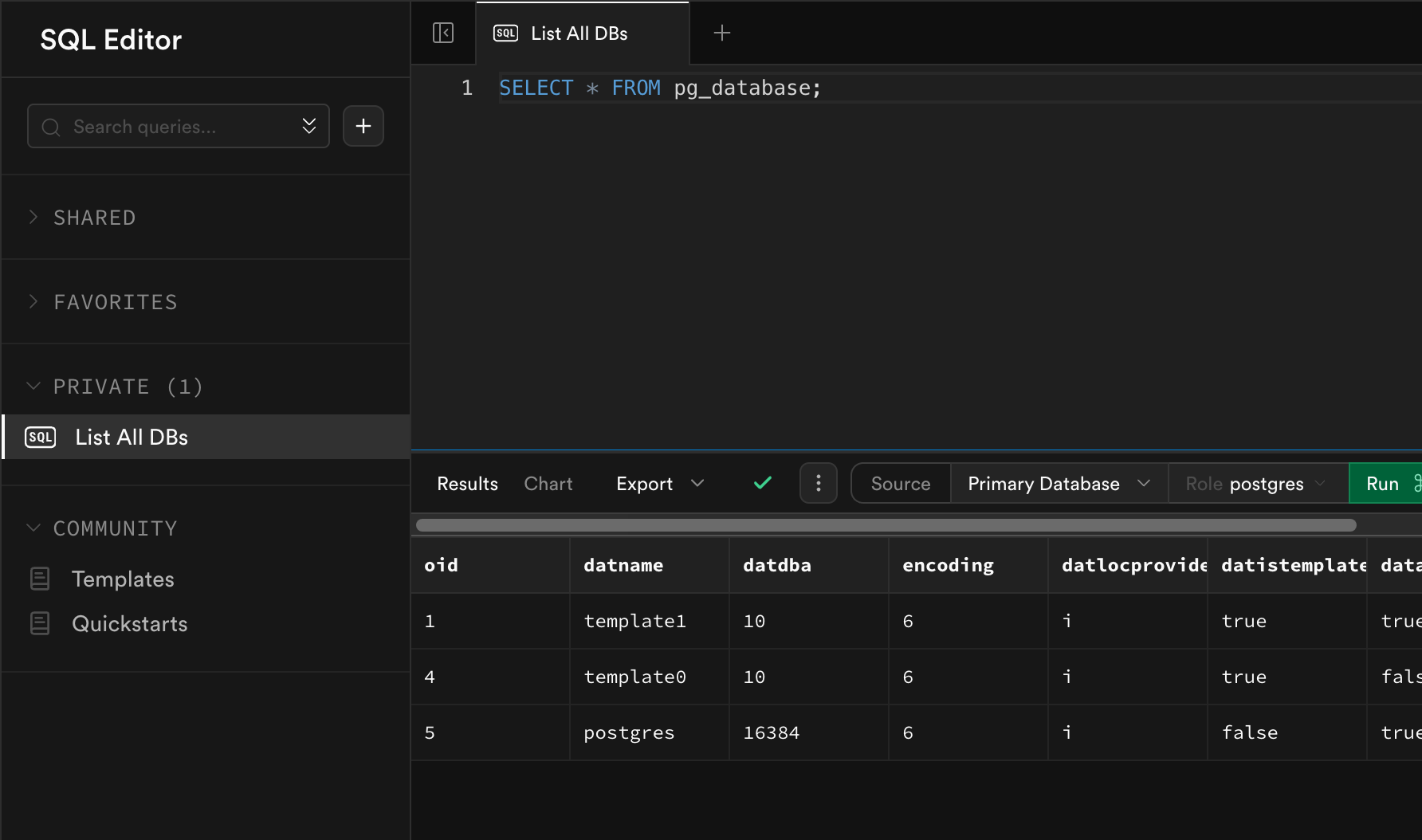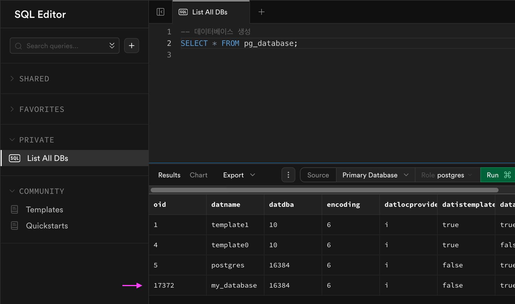 SELECT * FROM pg_database;- 현재 이 데이터베이스가 가지고 있는 모든 데이터베이스를 확인할 수 있다.